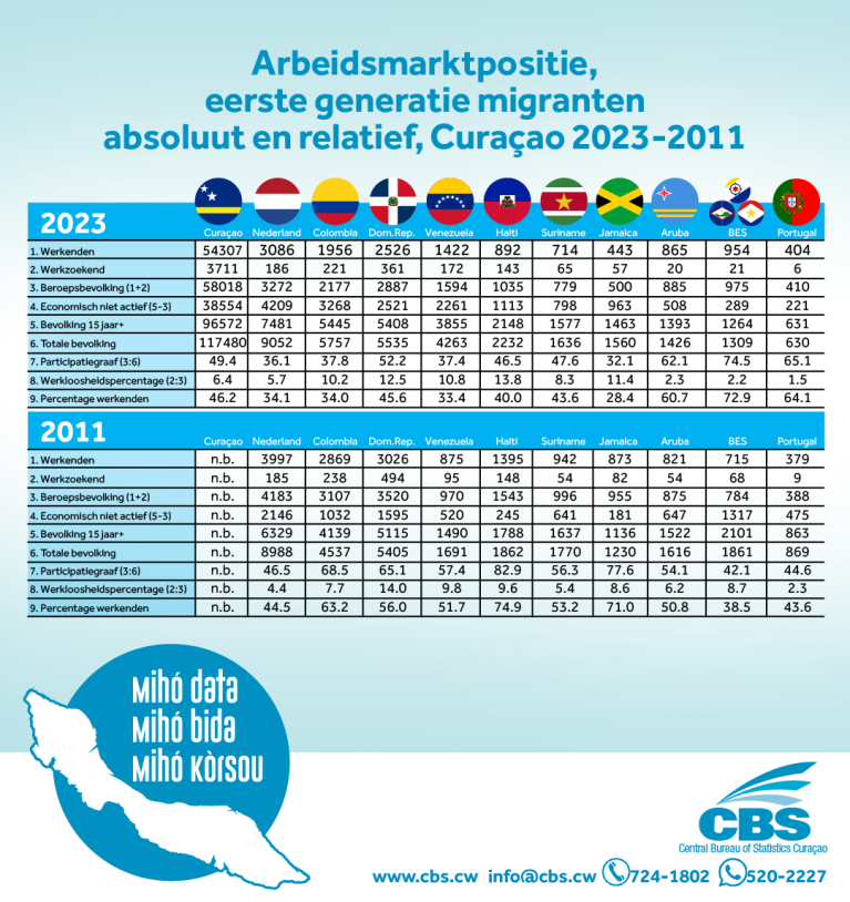 Migranten uit de BES-eilanden, Aruba en Portugal nemen in 2023 het meest deel aan de arbeidsmarkt. Werkloosheid is het hoogst bij de Dominicaanse Republiek, Venezuela en Haïti. Vergeleken met 2011 zijn de verhoudingen met betrekking tot werkloosheid grotendeels gelijk gebleven. Ten opzichte van 2011 verschoven meer mensen – zowel in Curaçao als in migrantengroepen – naar hogere inkomenscategorieën. De relatie tussen opleiding en inkomen verschilt sterk per herkomstgroep. Nederlandse migranten worden het meest beloond naar opleidingsniveau, terwijl Caribische en Latijns-Amerikaanse migranten, zoals Venezolanen en Dominicanen, vaak in een lagere inkomenscategorie vallen ondanks een hoog opleidingsniveau. Dit wijst op beperkte erkenning van buitenlandse diploma’s.