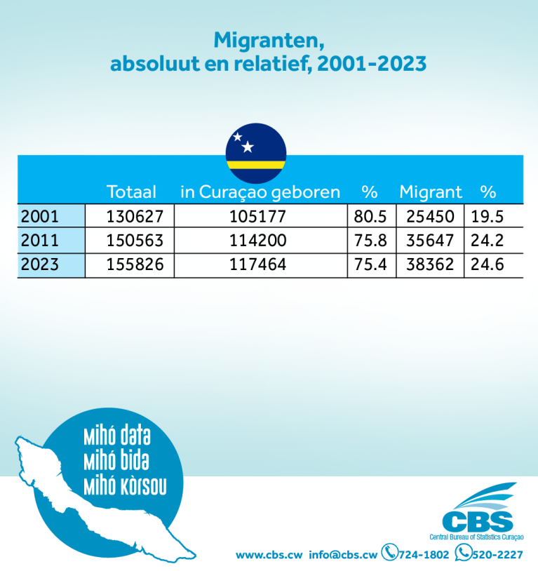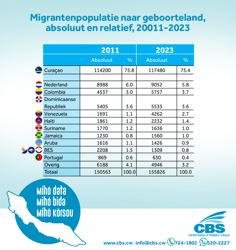 In 2023 telde Curaçao 155.826 inwoners, waarvan 75,4% in Curaçao geboren is. Migranten vormen 24,6% van de bevolking, een lichte stijging ten opzichte van 2011 (24,2%). De grootste migrantengroepen komen uit Nederland, Colombia en de Dominicaanse Republiek. Het aandeel Colombianen groeide ten opzichte van 2011, terwijl Venezolanen eveneens sterk toenamen. Migranten uit Suriname, Aruba, BES-eilanden en Portugal namen juist af.